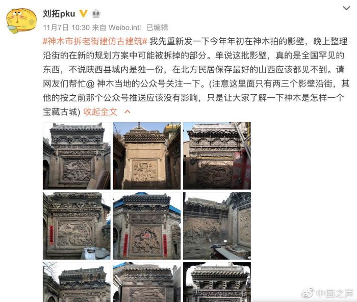这位博主的相关言论还被名为“古村之友”的微博整理成名为《陕西神木古城将拆除老街兴建仿古建筑?不可理喻!》的文章,引发大量网友参与讨论。“刘拓PKU”告诉中国之声记者,这种“拆旧城建仿古建筑”的做法在他看来不可接受,当地完全可以做一些修复。 “南北大街其实也有很多老房,它是老的铺面房,如果你整治的话你可以把结构保留下来,然后再安上老门之类的,没有必要把它拆掉。因为现在拆除的做法相当于是建一个二层那种房子,跟当地的风貌就不是很和谐。”