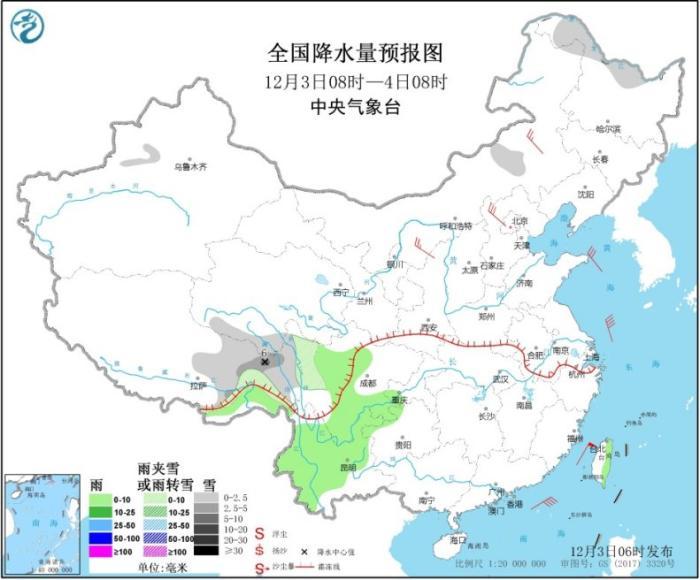 12月3日08时至4日08时,黑龙江北部、青藏高原东部等地的部分地区有小到中雪或雨夹雪,其中,西藏东北部局地有大雪。四川中南部、云南、贵州西北部及台湾岛东部等地的部分地区有小雨或阵雨。内蒙古、河北北部等地的部分地区有4~6级风(见图1)。