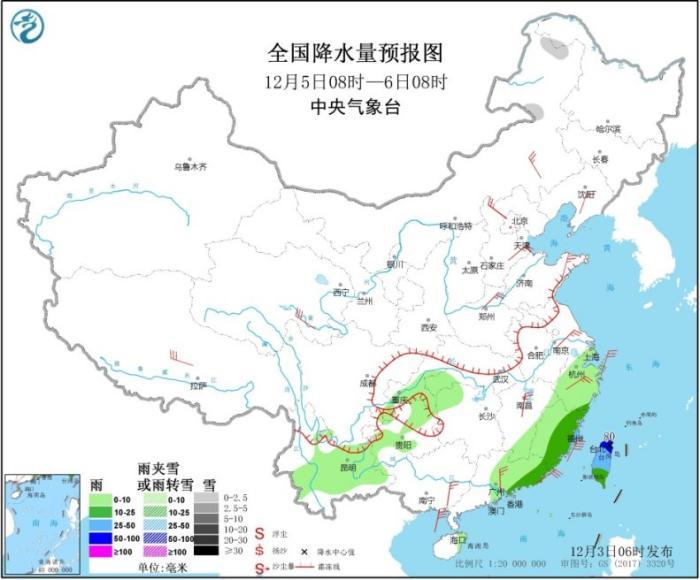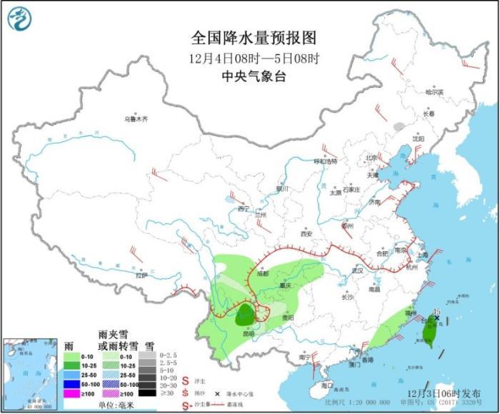 图1 全国降水量预报图(12月3日08时-4日08时)