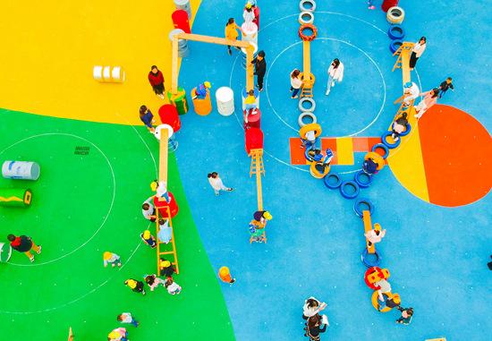 10月10日,江苏南通如皋市,安定幼儿园的小朋友在快乐地玩混龄户外游戏。(无人机拍摄)视觉中国供图