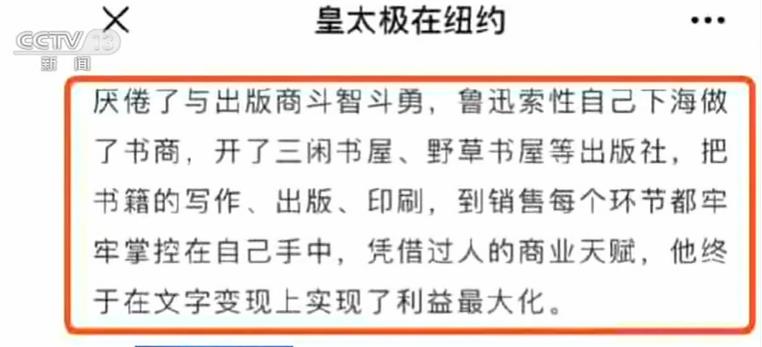 日前,一个名为“皇太极在纽约”公众号因为发表了一篇题为《贪财的鲁迅》的文章登上了热搜,文中将鲁迅开三闲书屋、野草书屋等解读为“为赚钱而下海做书商”,并得出“鲁迅凭借过人的商业天赋、在文字变现上实现了利益最大化”,最后笔锋一转,目的竟是为推销理财课。这一行为在网上引发网友强烈不满,有网友表示:这是对鲁迅先生的侮辱。事后这位作者发文称,引用鲁迅的事迹都有证可考,文章并非造谣诽谤,而是表现鲁迅很有经济头脑,也很会赚钱。