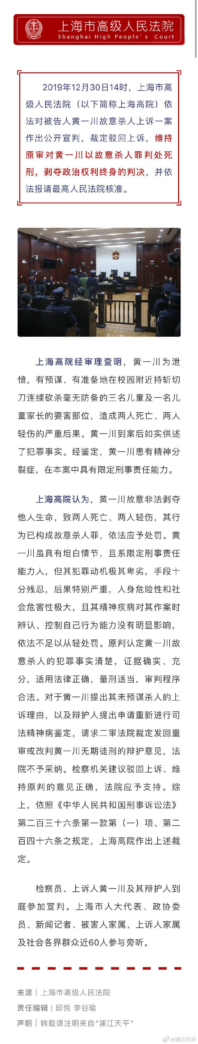 2019年12月30日14时,上海市高级人民法院依法对被告人黄一川故意杀人上诉一案作出公开宣判,裁定驳回上诉,维持原审对黄一川以故意杀人罪判处死刑,剥夺政治权利终身的判决,并依法报请最高人民法院核准。