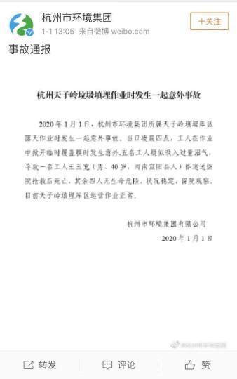 中新网杭州1月1日电(钱晨菲)1月1日,杭州市环境集团发布事故通报称,该集团所属天子岭填埋库区露天作业时发生一起意外事故。当日4时,工人在作业中掀开临时覆盖膜时发生意外,五名工人疑似吸入过量沼气,导致一名工人王玉宽(男,40岁,河南宜阳县人)昏迷送医院抢救后死亡,其余四人无生命危险,状况稳定,留院观察。