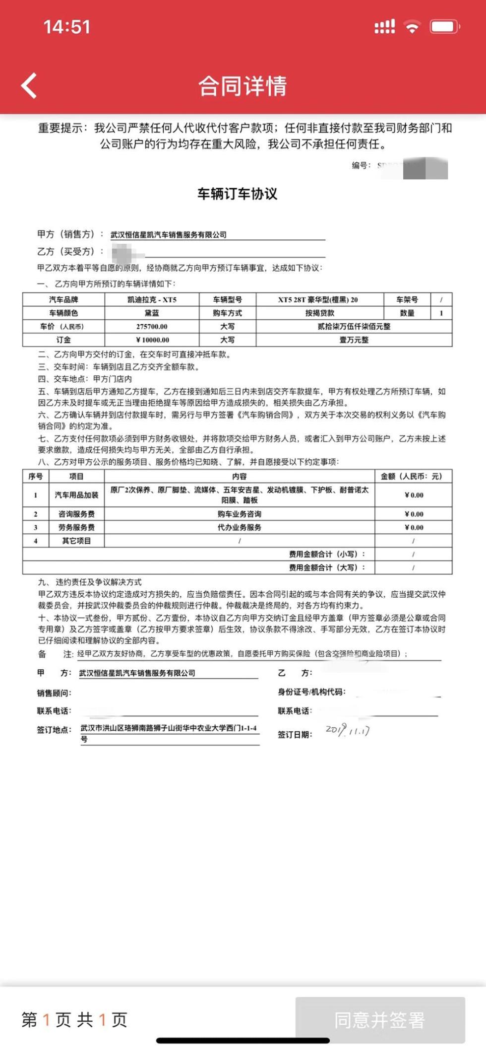 曹女士介绍,2019年11月份,在武汉国际博览中心车展凯迪拉克的展台上,她当场订购了一辆黑色的凯迪拉克XT5轿车,与销售多次沟通后的价格为275700元,当日签订了订车协议,并支付购车订金1万元,与销售商定提车日期在“元旦前”。