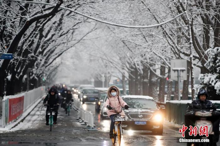 1月6日,北京迎来2020年的第一场雪,市民雪后出行。中新社记者 盛佳鹏 摄