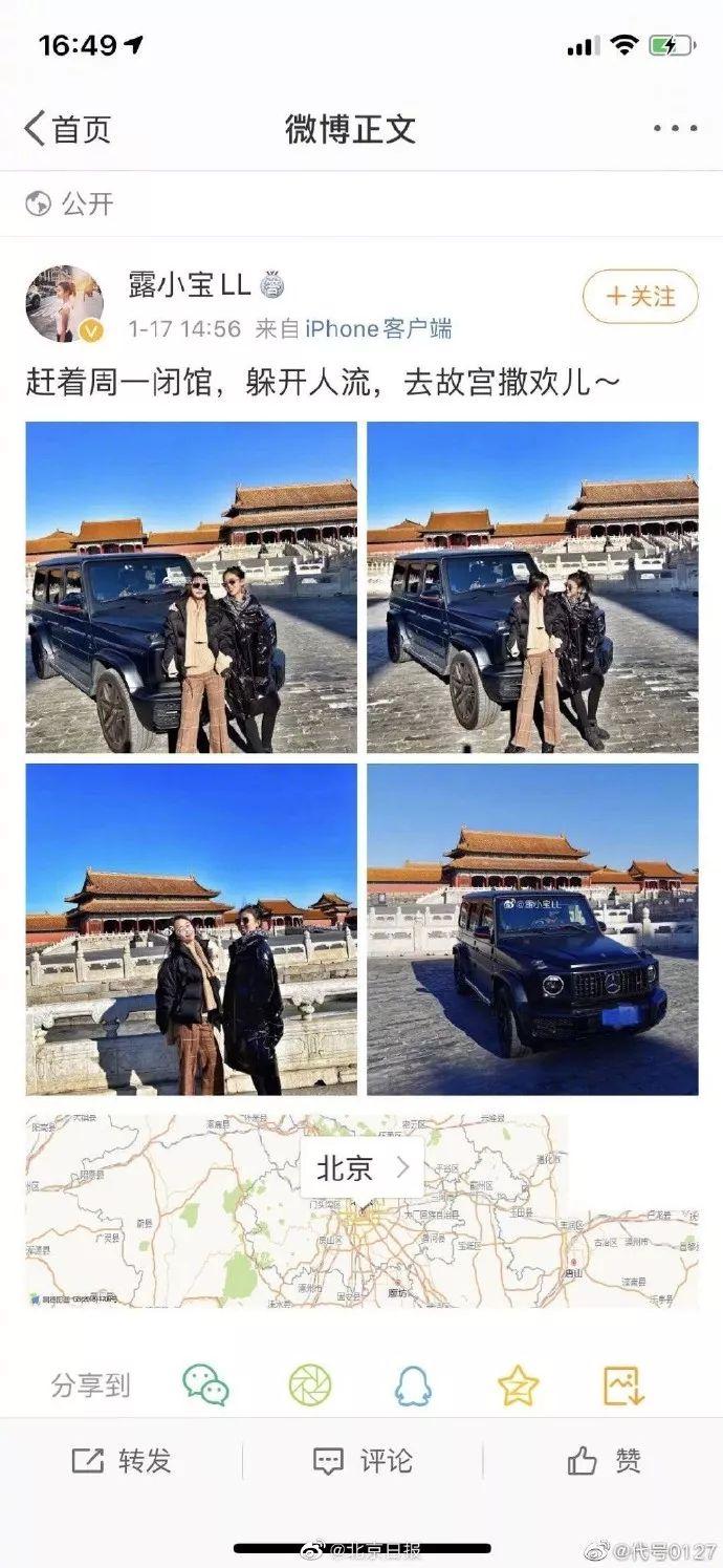 据媒体报道,1月17日14时56分,一位名为“露小宝LL”的用户通过微博发布一组照片,配文字是“赶着周一闭馆,躲开人流,去故宫撒欢儿~”。四张配图背景均为太和门广场,三张图片上有一辆黑色奔驰车出现。出镜的两位女士均着便服,没有佩戴任何故宫工作人员证件。