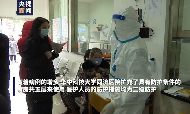 在华中科技大学同济医院的发热门诊,总台央视记者看到,随着病例的增多,这里扩充了具有防护条件的病房共五层来使用,医护人员的防护措施均为二级防护。