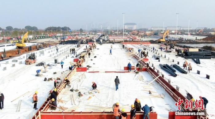 1月30日,武汉火神山医院施工现场,各项施工项目在全速推进中。中新社记者 张畅 摄