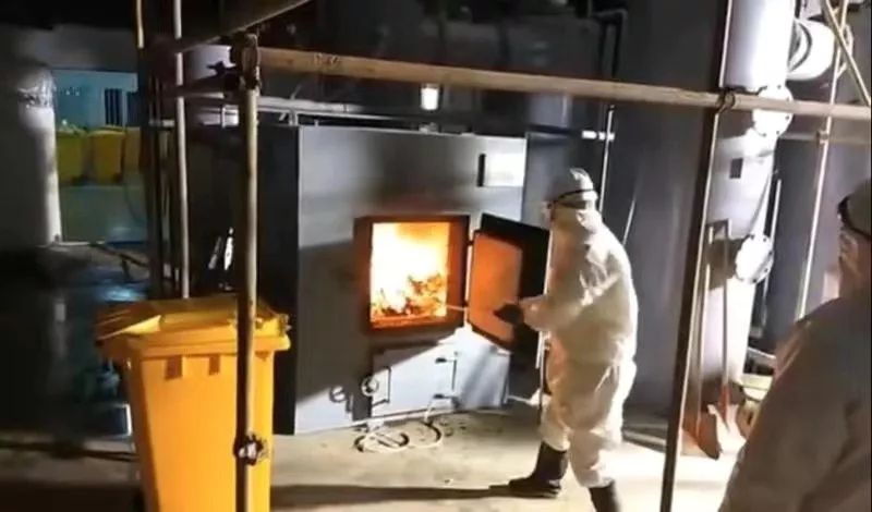 在医院外部,每个队员穿戴好防护装备,通过检查后进入工作区域。然后从运输团队那里接收医疗废物入库,并做好数量登记,双方交接签字。而后运输医疗废物至焚烧炉进行焚烧。
