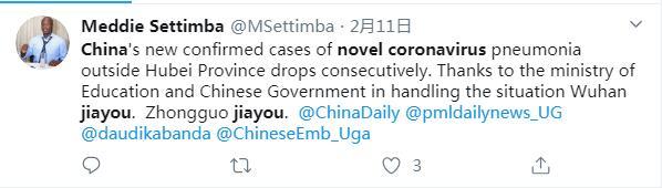 推特用户Meddie Settimba说:中国除湖北以外地区新增确诊新型冠状病毒感染的肺炎病例连续呈下降态势。感谢中国政府的有力应对。武汉加油,中国加油。