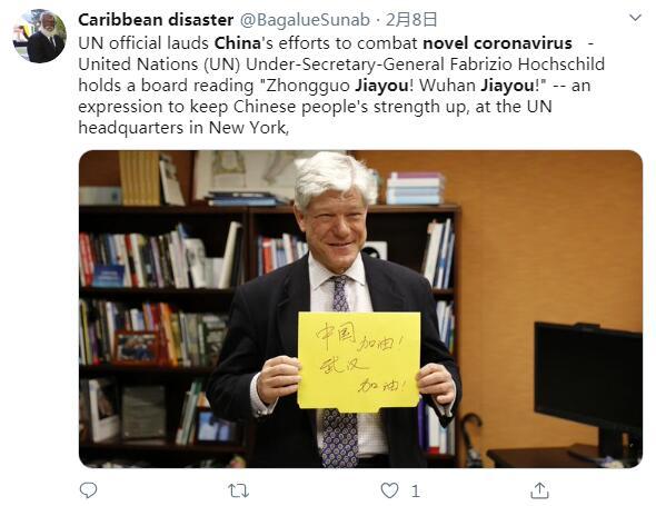 推特用户Caribbean disaster说:联合国官员赞扬中国为抗击新型冠状病毒所作出的努力。在联合国总部,联合国副秘书长法布里齐奥·霍克希尔德手持写着“中国加油!武汉加油!”的牌子,为中国人民加油打气。
