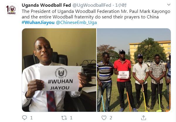 乌干达木球协会在推特上表示,乌干达木球协会主席保罗·马克·卡永戈和木球协会全体成员向中国送上良好祝愿——武汉加油。