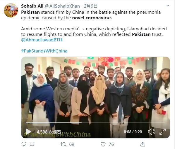 推特用户Sohaib Ali说:巴基斯坦坚决支持中国抗击新型冠状病毒感染的肺炎疫情。尽管一些西方媒体做出了负面报道,巴基斯坦还是决定恢复与中国的航班,这表明了巴基斯坦对中国的信任。