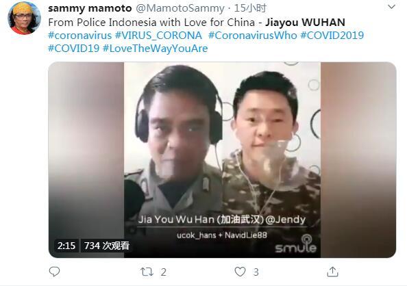 推特用户sammy mamoto说:印度尼西亚警察热爱中国,加油武汉。