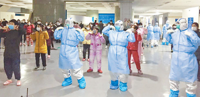 2月12日,武汉国际会展中心方舱医院,医护人员和患者一起跳舞。程少文摄(影像中国)