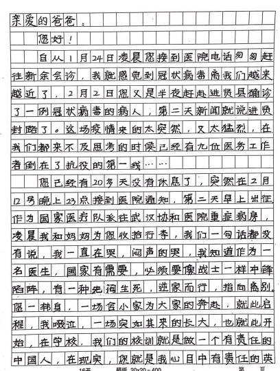 不负神圣职责和使命是龚园其的信念。他的女儿龚关越也同样知道,父亲是为了抗击疫情,为了留住更多人的生命。于是,她手写了一封家书,向奋战在抗疫一线的父亲致敬。