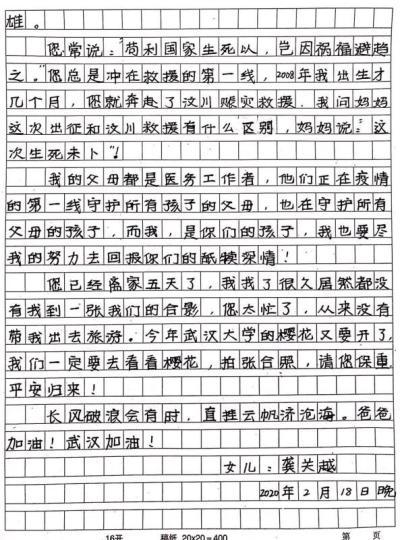 她还在家书中对父亲说:“您已经离家好几天了,我找了好久居然都没有找到一张我们的合影。您太忙了,从来没有带我出去旅游。今年武汉大学的樱花又要开了,我们一定要去看看樱花,拍张合照,请您保重,平安归来!长风破浪会有时,直挂云帆济沧海。爸爸加油!武汉加油!”(完)