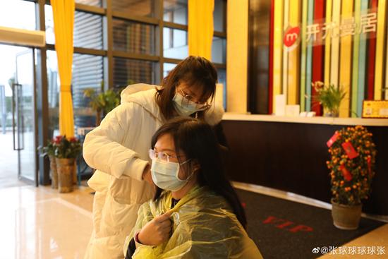 2月12日,一位医护人员在给同伴理发。她们都在武汉国际博览中心方舱医院工作。@张球球球球张