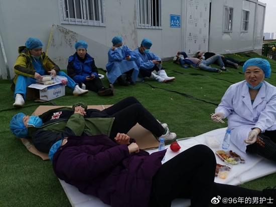 2月14日,武汉雷神山医院,辽宁医疗队队员在布置病区的间隙小憩。@96年的男护士