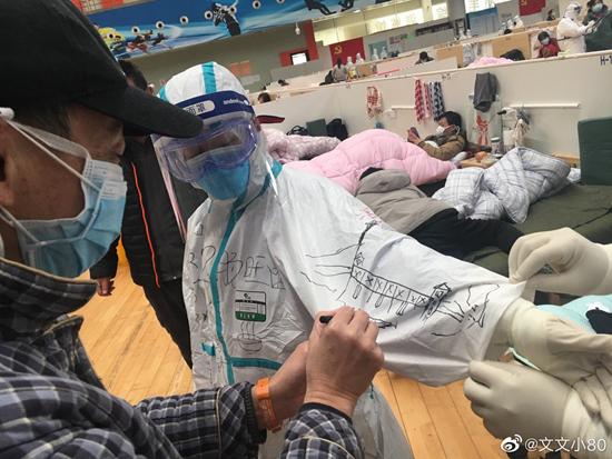 2月19日,武汉体育中心方舱医院,贵州医疗队队员邀请患者将贵州和武汉的美食、名胜古迹画在他们的防护服上。@文文小80