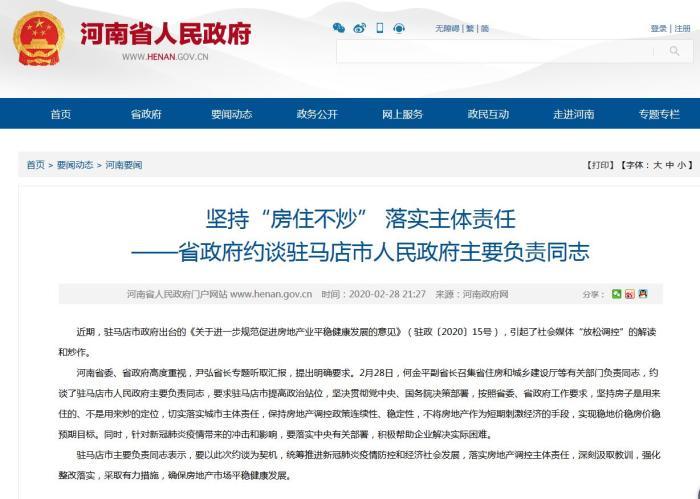 中新网2月29日电 据河南省人民政府门户网站消息,日前驻马店出台《关于进一步规范促进房地产业平稳健康发展的意见》,引起社会媒体“放松调控”的解读和炒作。河南省政府约谈驻马店市人民政府主要负责同志。