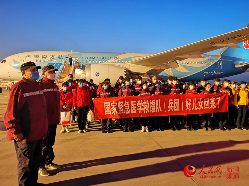 新疆生产建设兵团支援湖北医疗队抵达乌鲁木齐机场。陈新辉摄
