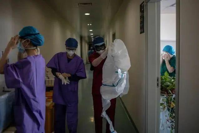 武汉大学人民医院东院区,即将进入污染区的护士们在穿戴防护用具。