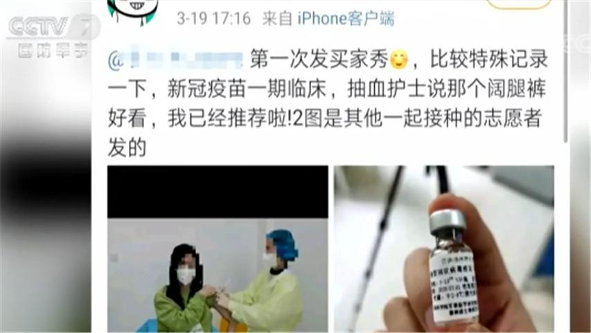 央视网消息: 近日,一位姑娘在微博发的一条买家秀引发了网友热议,她在微博上中说“第一次发买家秀,记录一下,新冠疫苗一期临床,抽血护士说那个阔腿裤好看,我已经推荐了。”配图是她在接受疫苗接种的画面,和疫苗药瓶。微博发出后,致敬和祝福将这位姑娘的评论区挤得满满当当。有网友点赞:“小姐姐,你好厉害,超棒!”也有网友祝福:“勇敢善良的人,平平安安,健健康康!”