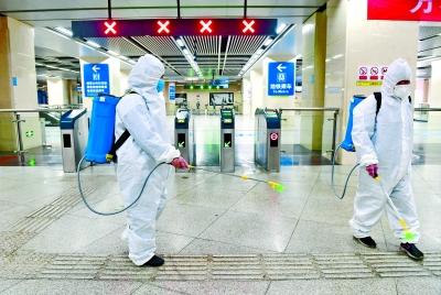 3月23日,地铁2号线汉口火车站站,保洁人员对车站进行全面消毒 长江日报记者李永刚 摄