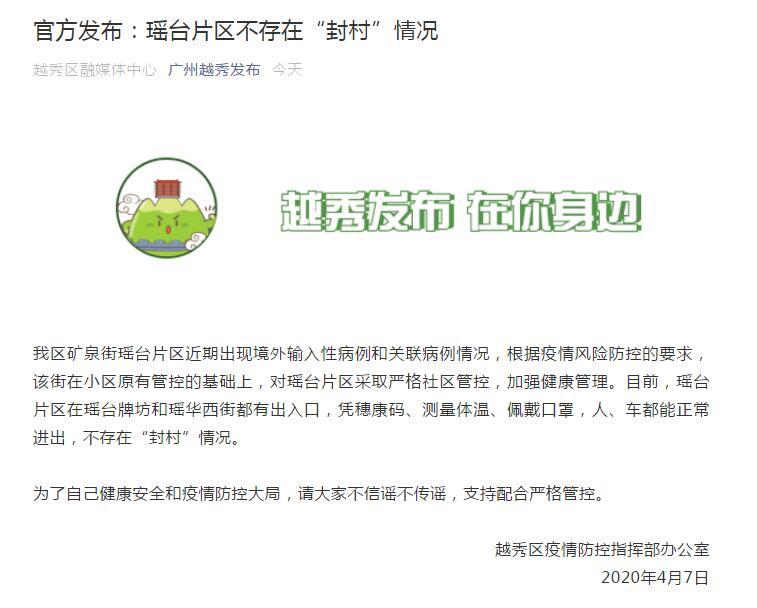 广州越秀区官方通报:瑶台片区不存在“封村”情况