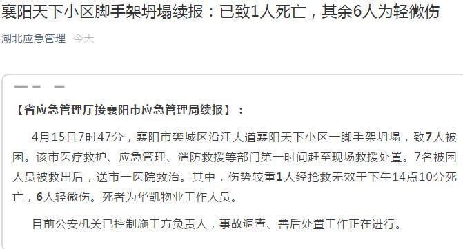 中新网4月16日电 据湖北应急管理厅微信公众号消息,4月15日7时47分,襄阳市樊城区沿江大道襄阳天下小区一脚手架坍塌,致7人被困。该市医疗救护、应急管理、消防救援等部门第一时间赶至现场救援处置。7名被困人员被救出后,送市一医院救治。其中,伤势较重1人经抢救无效于下午14点10分死亡,6人轻微伤。死者为华凯物业工作人员。