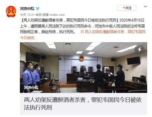 中新网4月16日电 据广西壮族自治区河池市中级人民法院官方微博消息,2020年4月16日上午,遵照最高人民法院下达的执行死刑命令,河池市中级人民法院依法将故意杀人罪罪犯韦国民验明正身,押赴刑场,执行死刑。