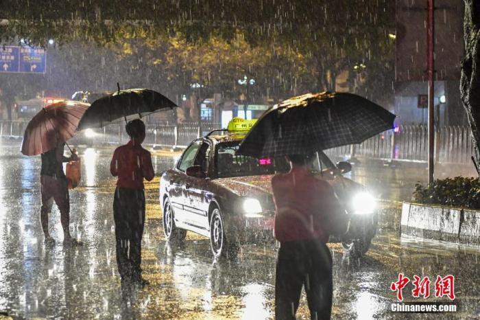 资料图:广州市民冒雨在路边等待出租车。中新社记者 陈骥旻 摄