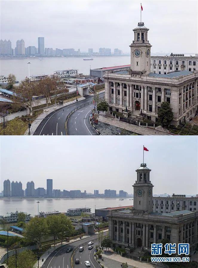 上图为1月26日拍摄的武汉地标江汉关大楼(无人机照片);下图为4月8日拍摄的武汉地标江汉关大楼(无人机照片)。新华社记者 熊琦 摄