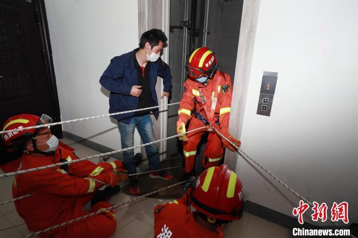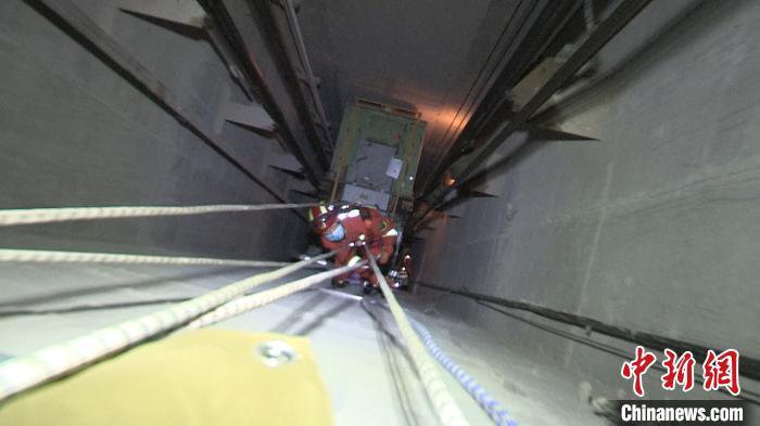 消防员发现,小区居民楼为商住混用,一楼到四楼之间为封闭式,男童被卡在三楼和四楼之间,电梯的位置距井底大概有20米的高度。在电梯维修人员配合下,消防员首先对电梯进行固定,防止电梯在救援过程发生升降,然后由两名救援人员在五楼电梯口,利用安全绳做好防护措施后,下到井内实施救援。