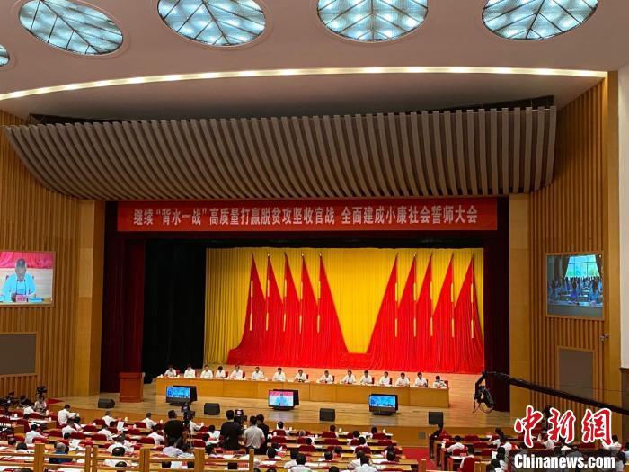 海南省17日召开“继续‘背水一战’高质量打赢脱贫攻坚收官战全面建成小康社会誓师大会”。 王子谦 摄