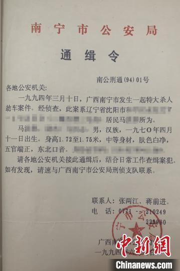 图为南宁市公安局1994年发布的通缉令。 南宁市公安局兴宁分局供图 摄