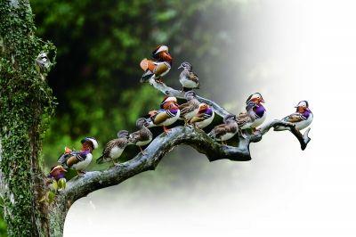 发展生态观鸟旅游,促进村民增收。图为明溪县盖洋镇城岚溪观鸟点,成群的鸳鸯上树的情景定格在观鸟摄影爱好者镜头下。林锦荣 摄