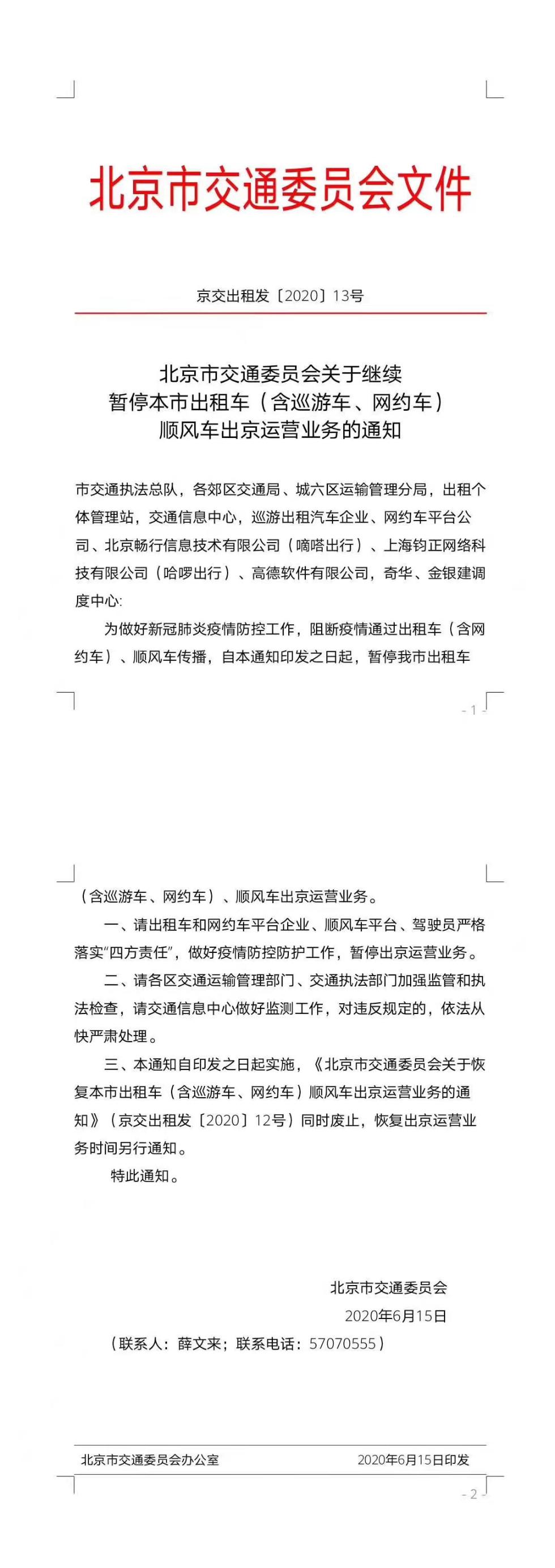 总台央视记者从北京市交通委获悉,为做好新冠肺炎疫情防控工作,阻断疫情通过出租车(含巡游车、网约车)、顺风车传播,从本月15日起,北京市出租车(含巡游车、网约车)、顺风车暂停出京运营业务。对违反规定的,交通运输管理部门、交通执法部门将依法从快严肃处理。恢复出京运营业务时间另行通知。