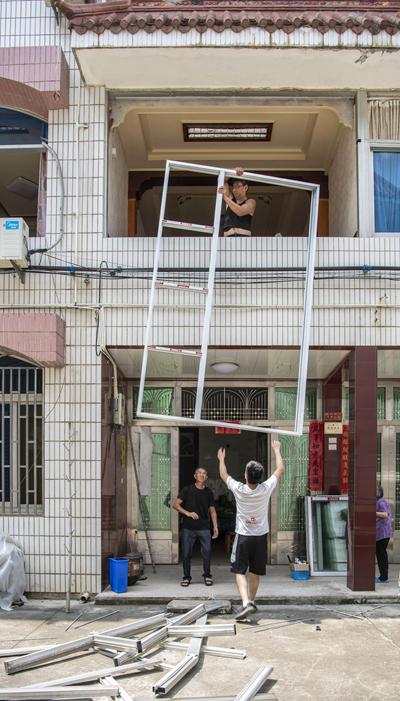 6月23日,浙江温岭大溪镇良山村,人们忙着为受损的房屋安装窗户。受访者供图