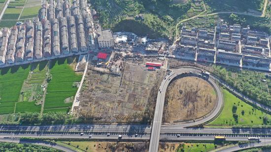 6月14日,浙江温岭,航拍受槽罐车爆炸冲击后的大溪镇良山村。人民视觉供图