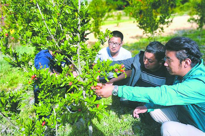 左布村党支部书记仁青次仁(右二)与驻村工作队员在地里查看石榴长势。本报记者 代 玲摄