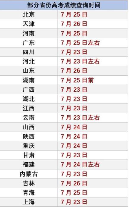 例如,江西、广西、湖北、甘肃、四川、内蒙古、上海等省份的查分时间都在7月23日;青海、北京、河南为7月25日;吉林、山东、天津为7月26日。