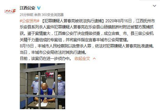 8月19日,丰城市人民检察院以故意杀人罪,依法对犯罪嫌疑人曾春亮批准逮捕。当日,丰城市公安局依法对其执行逮捕。目前,该案仍在进一步侦办中。