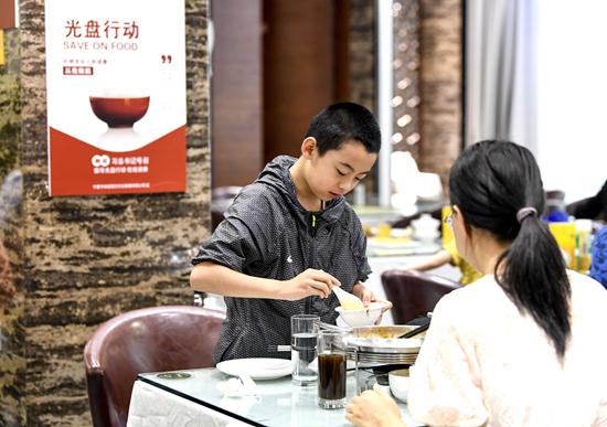 8月15日,记者走进位于内蒙古自治区呼和浩特市的一家粤菜餐厅,一进门就看到倡导“光盘行动”的海报,每张餐桌旁也都张贴着“节约粮食”“使用公筷”的标语。