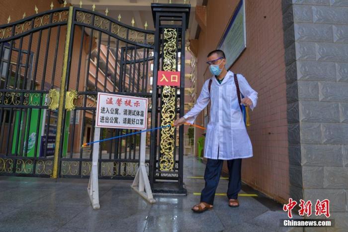 资料图:海口经济学院的工作人员在学生宿舍楼入口消毒。中新社记者 骆云飞 摄