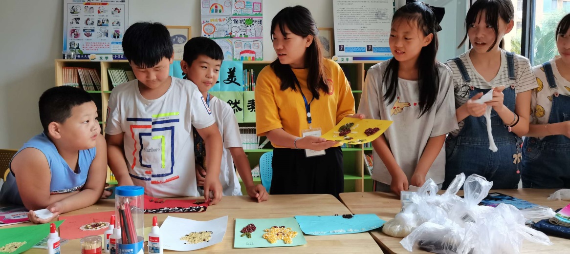 90后专业社工宁立静是孩子们的带班老师。“大家在玩‘五谷杂粮蹲’游戏,这是‘家乡之美’自然教育的一部分。为了让孩子们加深对家乡的了解,我还就地取材,设计了寓教于乐的豆子成食、豆子粘贴画等活动,他们都非常喜欢。”宁立静说。