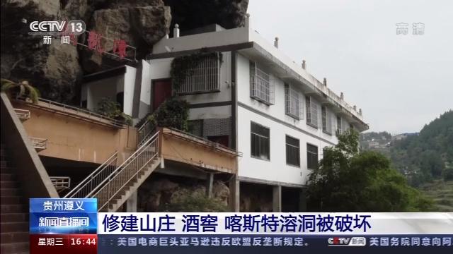 总台央视记者 史超杰: 在我身边山崖下的这两栋建筑,就是肖氏父子占用林地和耕地非法建设的山庄。而在我身后的这个喀斯特溶洞,就是他们非法开发以后,用于养殖娃娃鱼以及藏酒的酒窖。