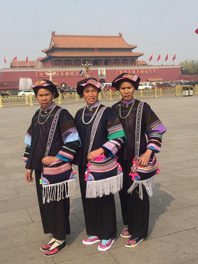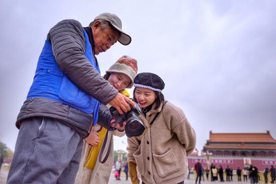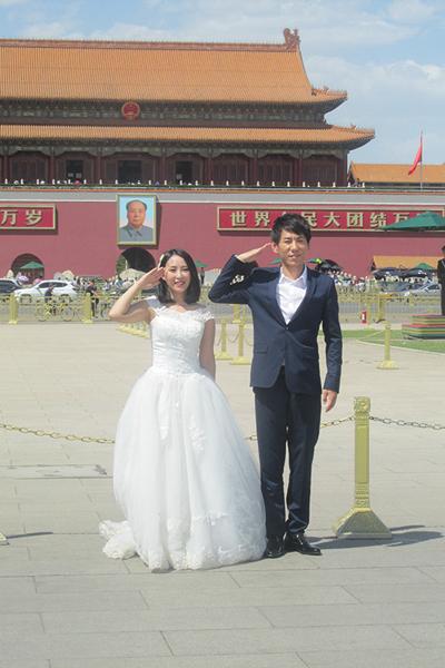 更多的人喜欢在纪念日到天安门留个纪念。一对来自云南的老夫妻,在金婚纪念日穿着情侣鞋、捧着老式的结婚证书来拍照,想让天安门见证他们50年的爱情。