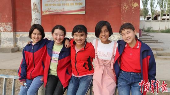 9月13日,巴克墩小学六年级5个都叫苏比努尔的女孩一起合影。中青报·中青网记者 王雪迎/摄